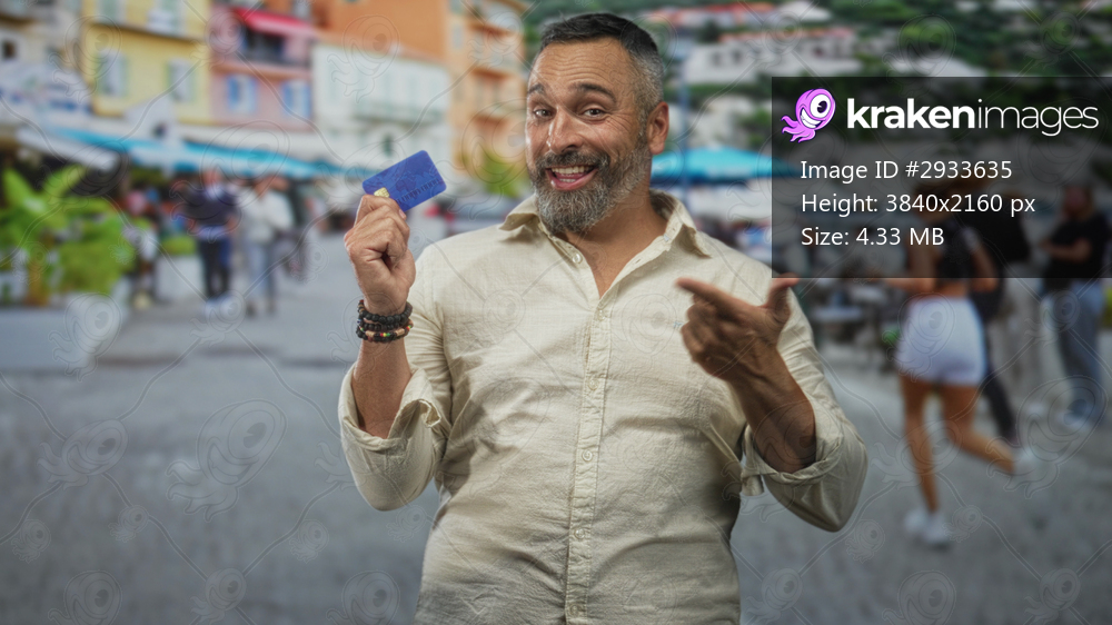 Man holding blue creditcard and finger pointing to card on a lively street market with cafes and pedestrians; confidence payment.