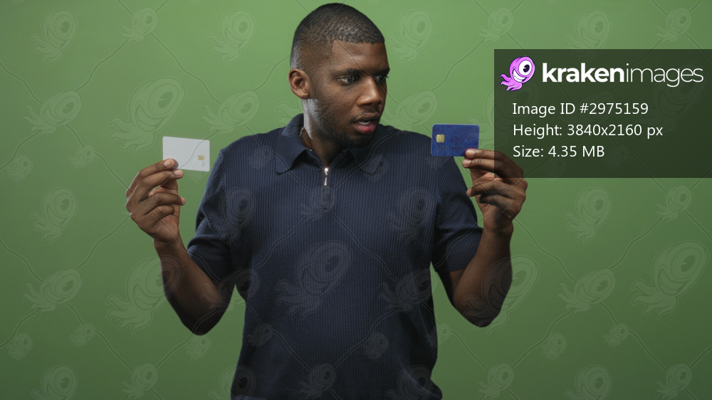 Man holding blue creditcard in right hand and white creditcard in left hand in a studio; choice confusion.