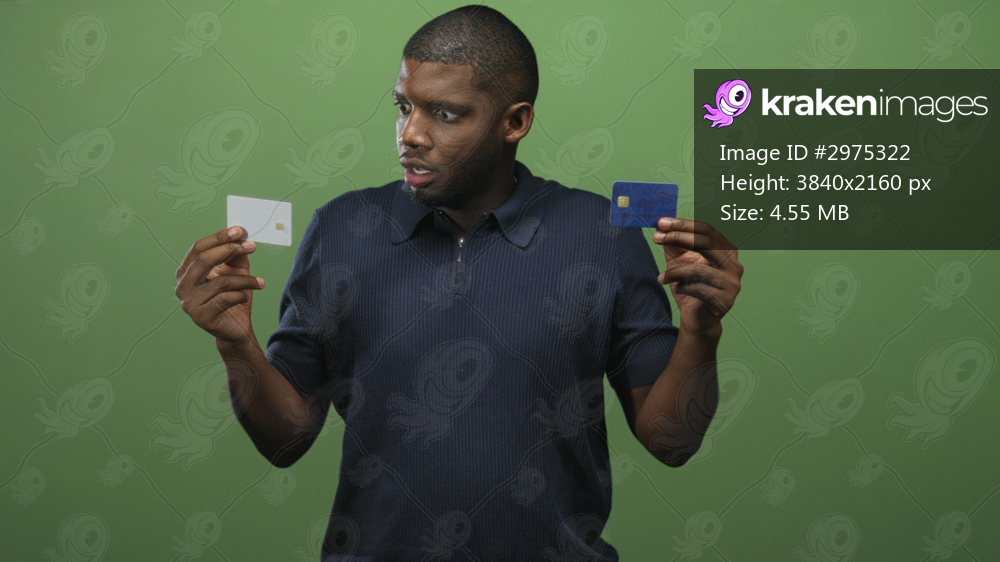 Man holding blue creditcard in right hand and white creditcard in left hand in a studio; choice confusion.