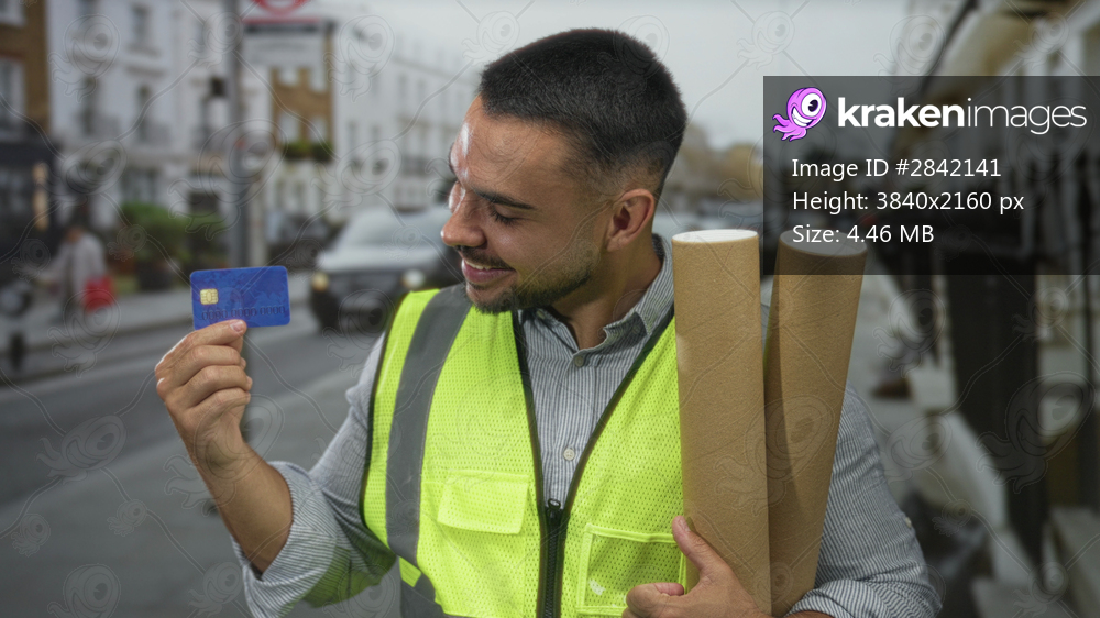 Man holding blue creditcard and rolled blueprint plans on street outside building; confidence ambition.