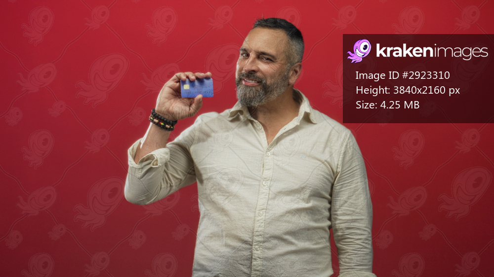 Man holding blue creditcard up to camera in red studio while smiling and making rock horns; financial confidence.