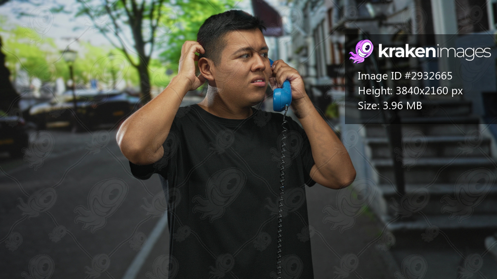 Man holding blue handset to ear on street, pressing head with other hand in pain from headache while grimacing; frustration.