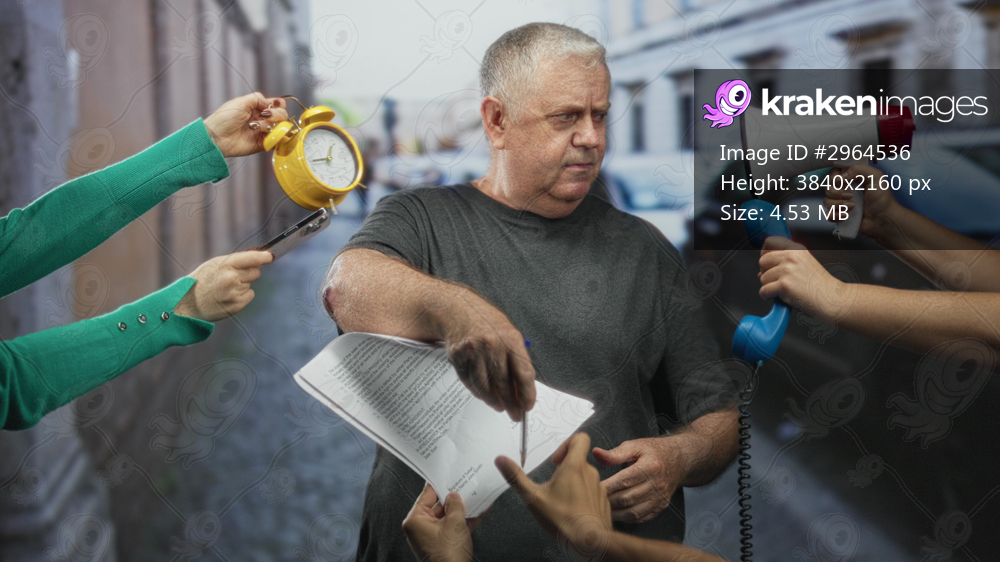 Man holding blue handset to ear while hands offer megaphone, alarm clock and papers on a street; stress confusion.