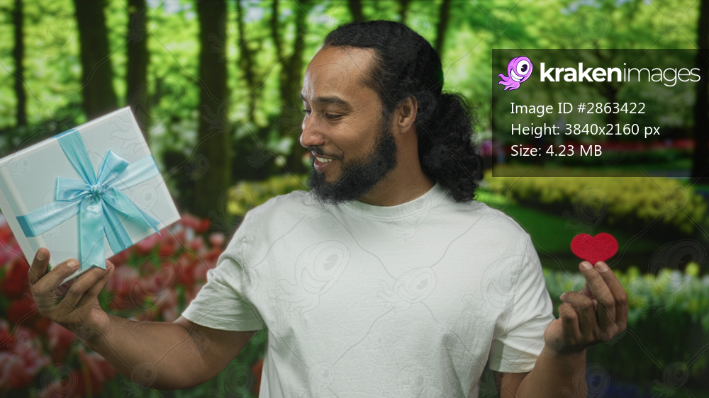 Man holding blue ribbon gift box and small red heart, smiling and offering with bare hands in a sunlit forest park among tulips; romance generosity.