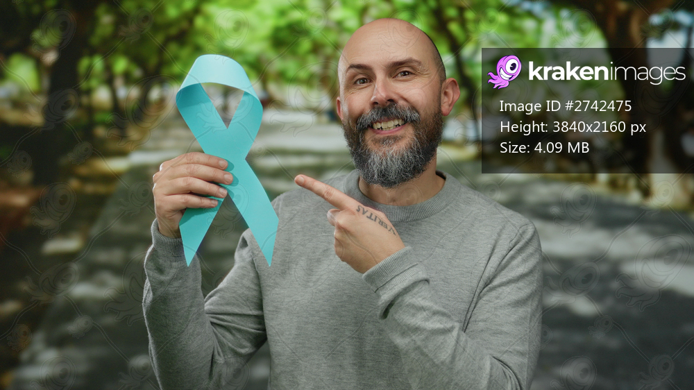 Man holding blue ribbon smiling outdoors in a park setting suggesting cancer awareness and support.