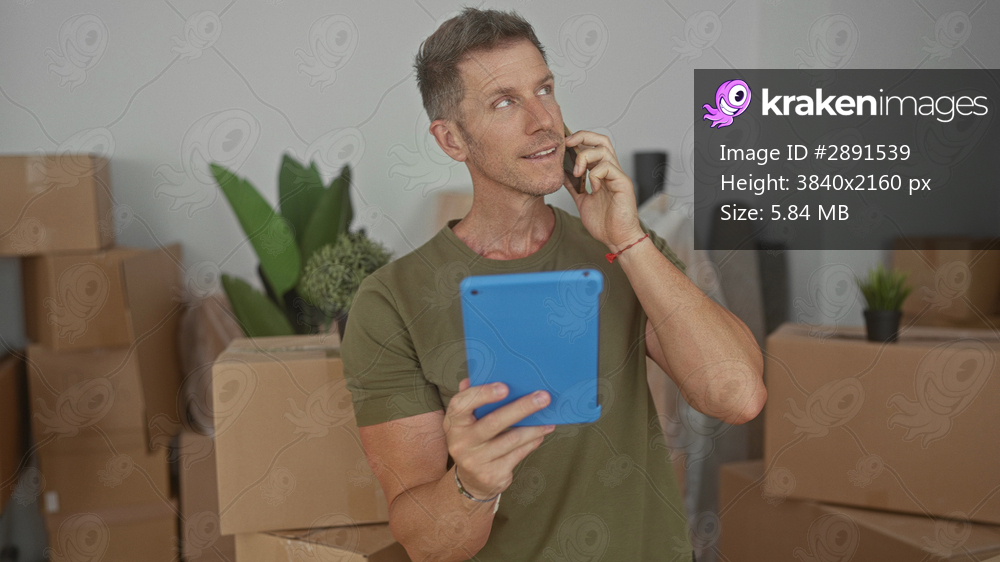 Man holding blue tablet and phone to ear in building full of moving boxes; moving planning focused organized.