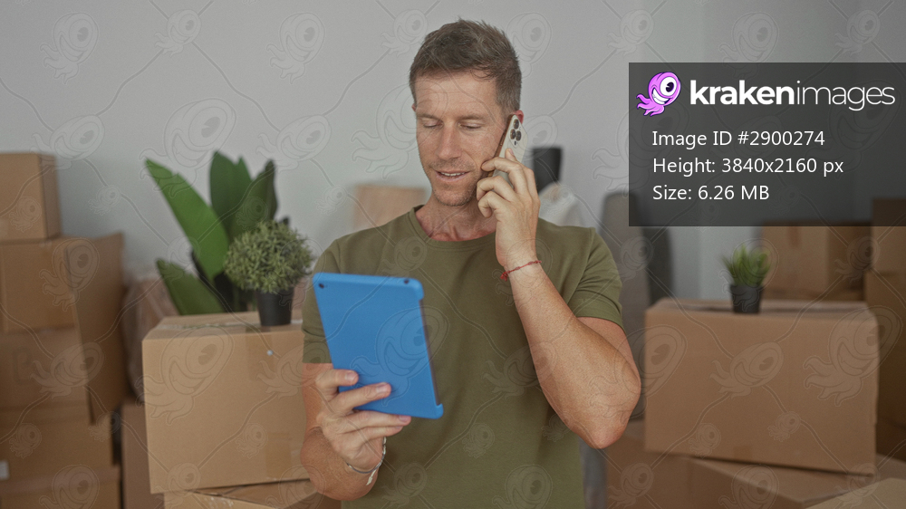 Man holding blue tablet and phone to ear in building full of moving boxes; moving planning focused organized.