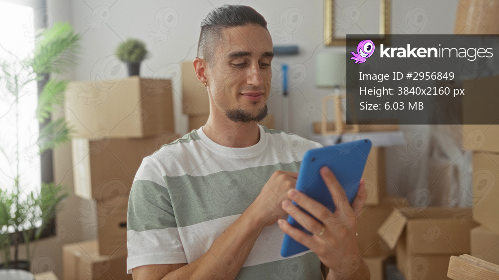 Man holding blue tablet tapping screen with right finger among stacked cardboard moving boxes and houseplants in a building; focused planning.