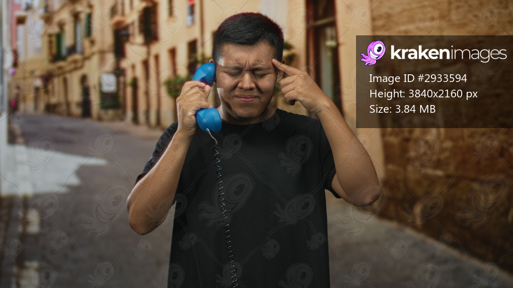 Man holding blue telephone handset and pointing finger to temple on old town street; frustration thinking.