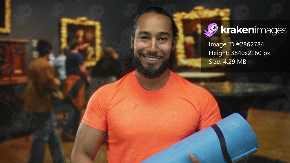 Man holding blue yoga mat and smiling while standing near framed paintings in gallery building wearing bright orange shirt; serenity curiosity.