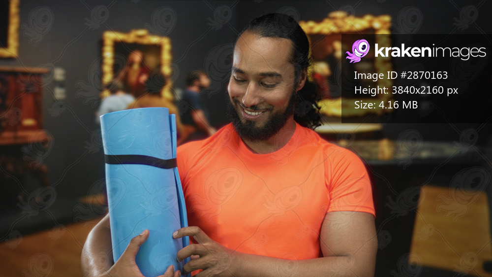 Man holding blue yoga mat and smiling while standing near framed paintings in gallery building wearing bright orange shirt; serenity curiosity.