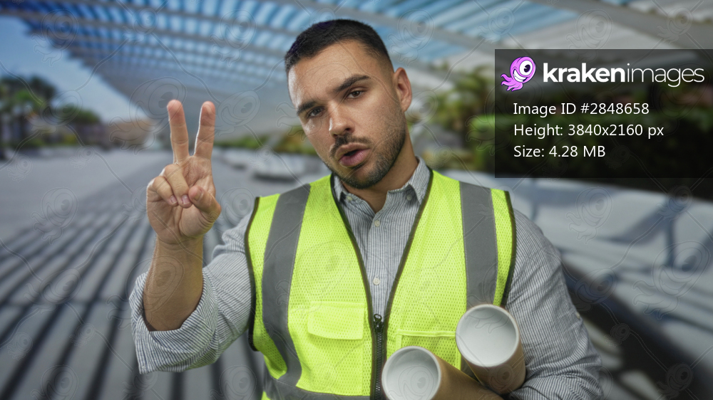 Man holding blueprint tubes points finger upward under building canopy in green park; determination.