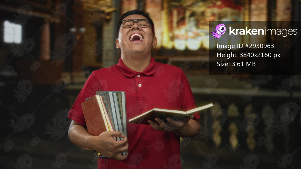 Man holding books and laughing while reading inside a church building, wearing red polo and glasses; joyful study.