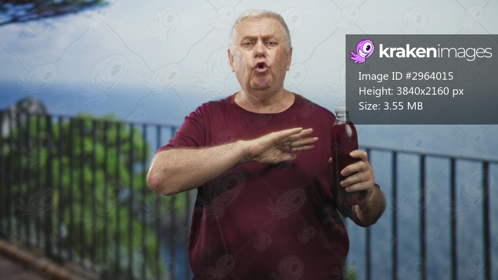 Man holding bottle of pomegranate juice, gesturing with hand and grimacing while wearing maroon shirt on a building balcony railing overlooking the sea; skepticism tasting. - Kraken Images