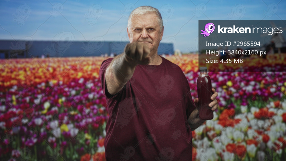 Man holding bottle of pomegranate juice points fist toward camera in building beside a vast tulip field, hand forward and firm; determination.