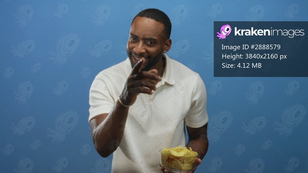 Man holding bowl of potato chips reaching forward with hand in studio against blue backdrop; cheerful sharing.