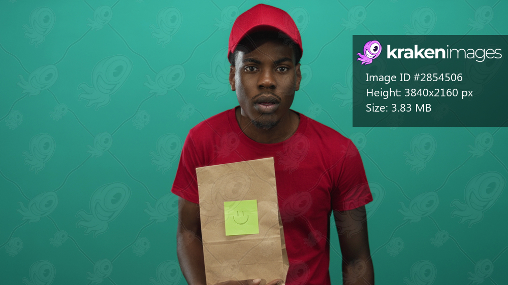 Man holding brown paper bag with green smiley sticker and pointing finger at camera in studio; urgency duty trust commitment.