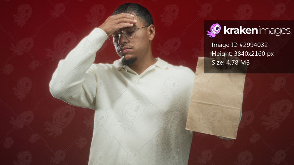 Man holding brown paper bag and pressing hand to forehead in studio with red backdrop and white sweater, glasses visible; frustration doubt.