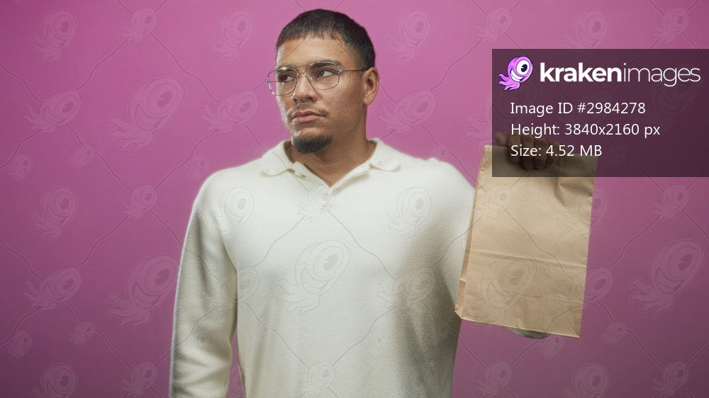Man holding brown paper bag with right hand visible, fingers gripping top, wearing glasses and white sweater, head tilted in studio; contemplation.