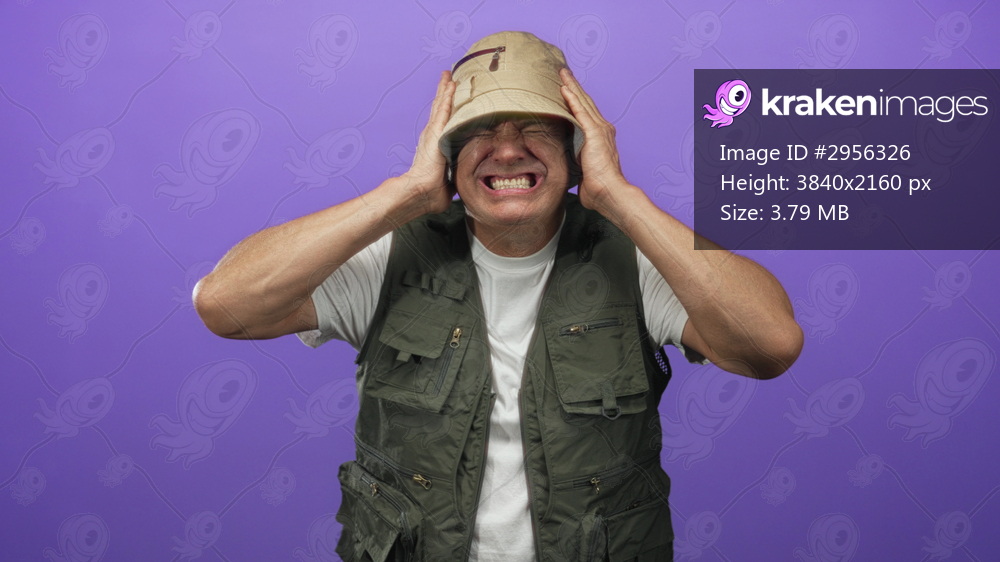 Man holding bucket hat over ears, grimacing with clenched teeth, wearing olive fishing vest and white t shirt against a purple studio backdrop; frustration. - Kraken Images
