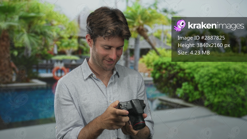 Man holding camera at a hotel pool in a resort outdoors checking settings on the camera; curiosity leisure.