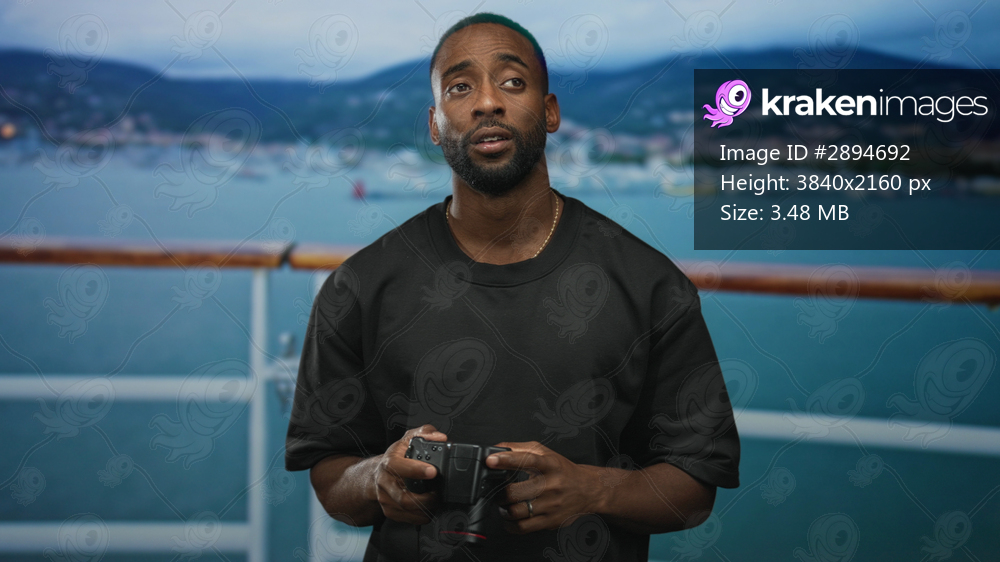 Man holding camera with both hands on ship deck, looking down at camera display in studio; calm concentration.