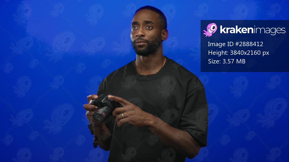 Man holding camera with hands on controls, wearing black t shirt, standing in studio against blue backdrop looking up; creative contemplation focus.