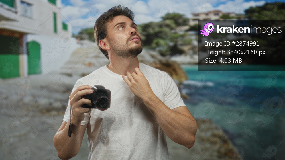 Man holding camera with right hand against seaside backdrop in studio set, looking upward and adjusting collar; contemplation travel memory.