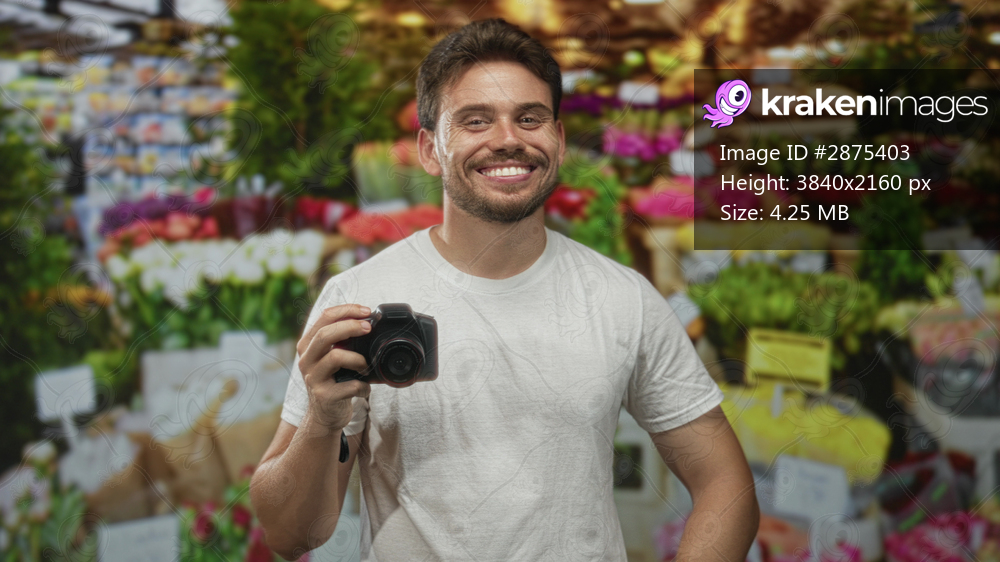 Man holding camera and smiling among colorful flower stalls in a market, young hispanic photographer; joy curiosity creativity.