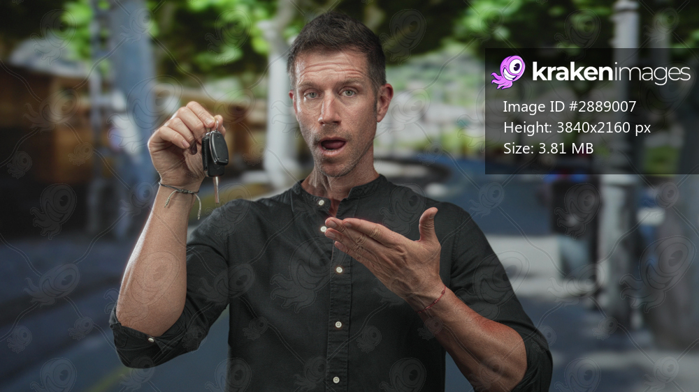 Man holding car key fob in hand on leafy street with mouth open and palm raised while wearing dark shirt; lost keys surprise.