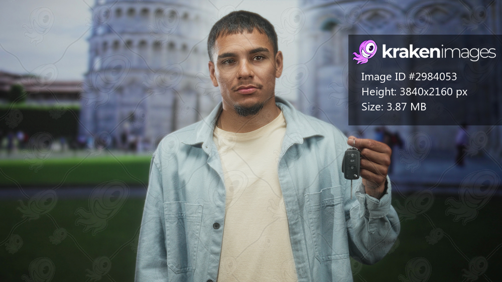 Man holding car key fob in hand, smiling and showing keys in front of building with a famous tower in a tourist piazza; travel joy.