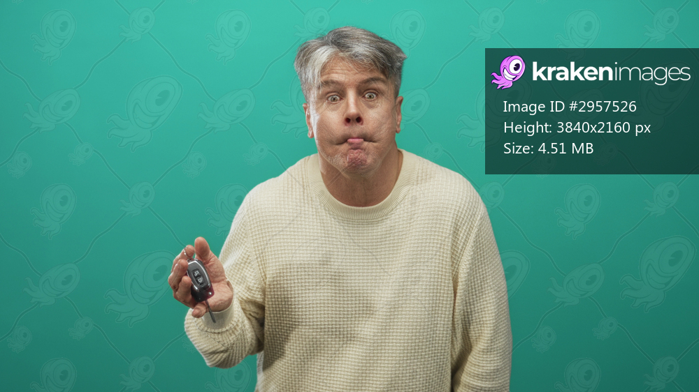 Man holding car key fob in one hand, puckering lips and shrugging before a teal studio wall; mild confusion.