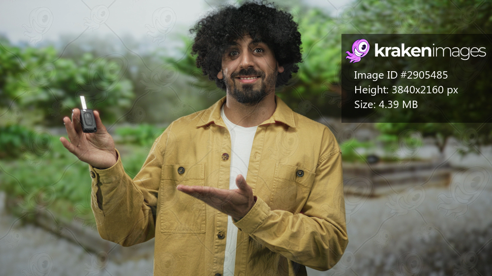 Man holding car key fob with raised hand and open palm gesture in park with green foliage, smiling; confidence convenience.