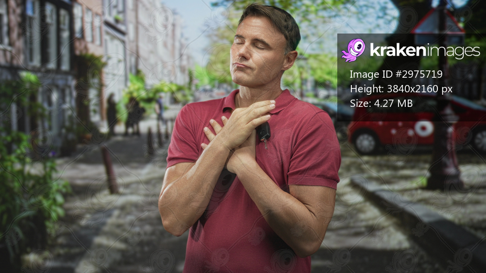 Man holding car key with hand on chest on tree lined street wearing red polo; gratitude home arrival.