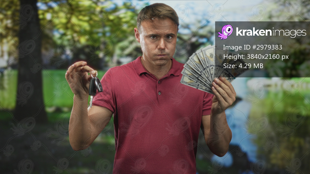 Man holding car keys and fanning a stack of us dollar bills while standing in a leafy forest park beside a pond, wearing a red polo and studying the money; temptation. - Kraken Images