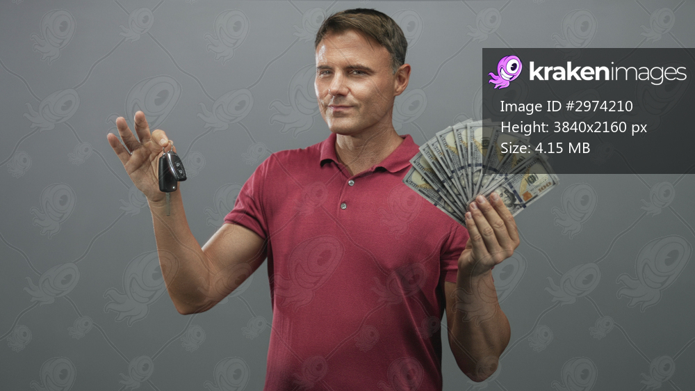 Man holding car keys and fanning us cash with hands in studio, gestures to keys with raised hand; temptation confidence.