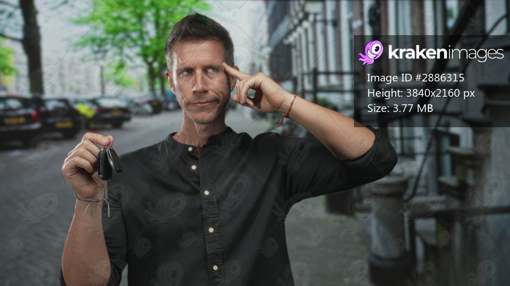 Man holding car keys and finger to temple on cobbled street beside parked cars and building facades; thinking doubt.