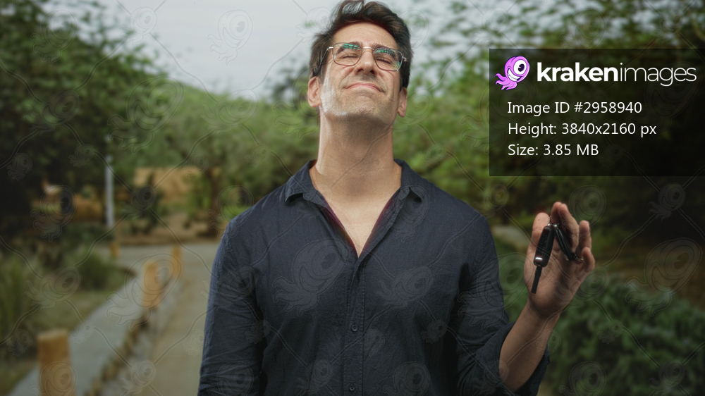 Man holding car keys in hand on street path, palm open and eyes closed in weary gesture; resignation uncertainty.