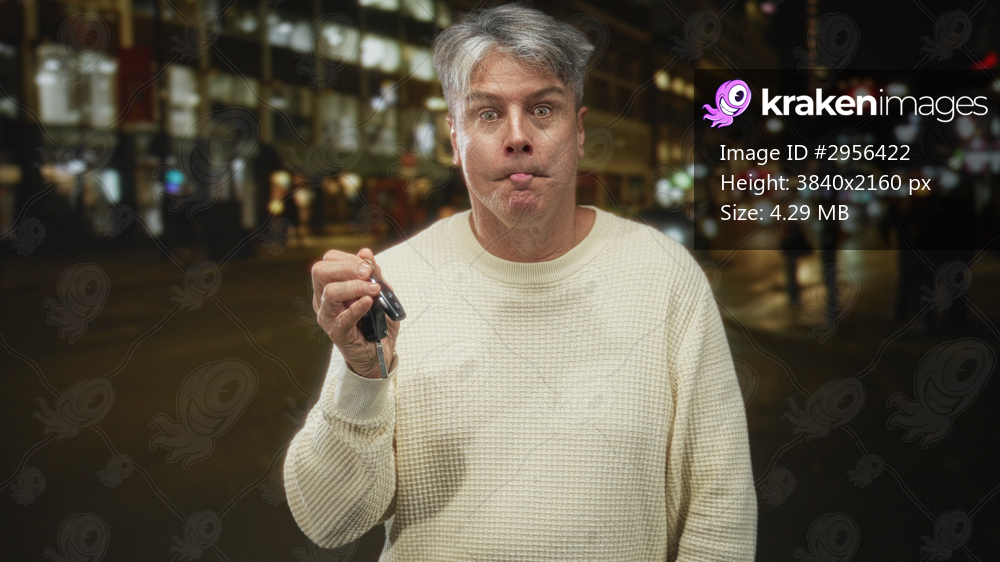 Man holding car keys in hand with pursed lips and slight shrug on a city street at night; late night confusion.