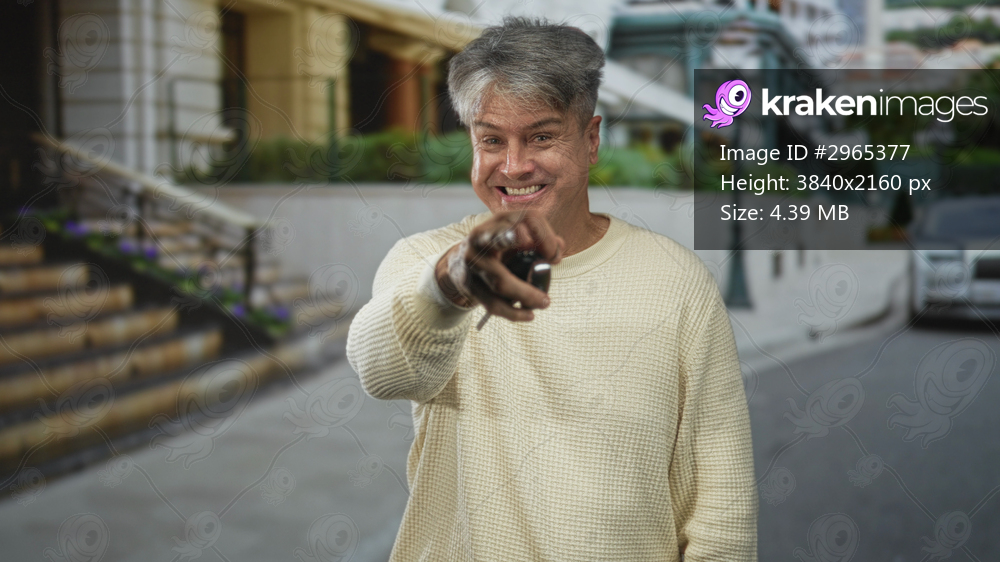 Man holding car keys in his hand and pointing them toward the camera on a city street by a building entrance, smiling warmly; happiness offering.