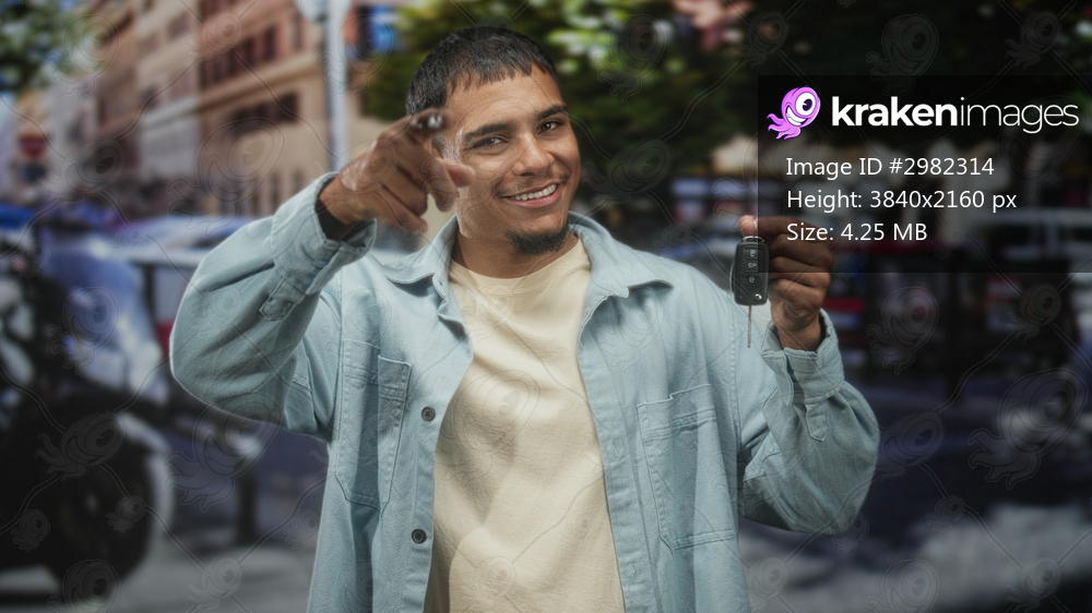 Man holding car keys in his right hand and pointing forward with left finger in an urban street scene with parked cars and storefronts; confidence new ownership. - Kraken Images