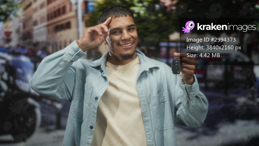 Man holding car keys in his right hand and pointing forward with left finger in an urban street scene with parked cars and storefronts; confidence new ownership. - Kraken Images
