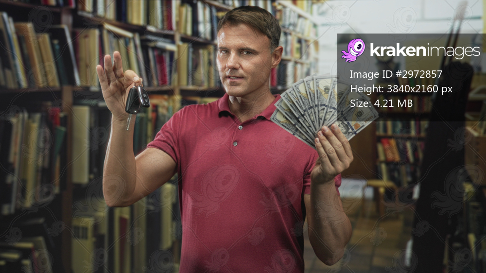 Man holding car keys in one hand and fanning a stack of us dollars with the other in a bookshop building; temptation decision confidence.