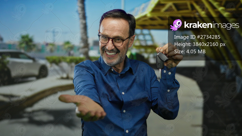 Man holding car keys outdoors with city street background urban location wearing glasses and blue shirt demonstrating hand gesture