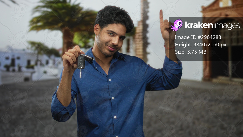 Man holding car keys and pointing finger upward in a cobblestone street plaza with palm tree and arched entrance; confidence new ownership.