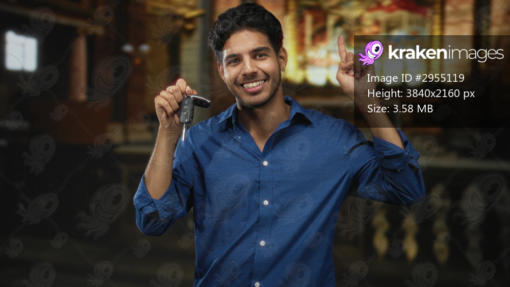 Man holding car keys and pointing index finger in an ornate church building near stained glass windows and a wooden altar, wearing a blue shirt with a subtle smile; quiet confidence. - Kraken Images
