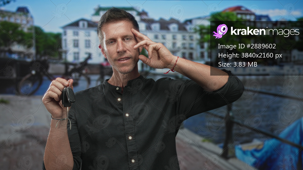 Man holding car keys and pointing to temple on street by canal buildings in amsterdam; confidence readiness.