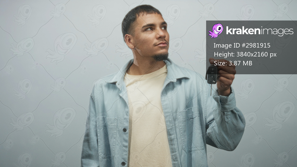 Man holding car keys with right hand in studio, looking upward and slightly offering the fob, wearing light denim shirt over beige tee; thoughtful reflection. - Kraken Images