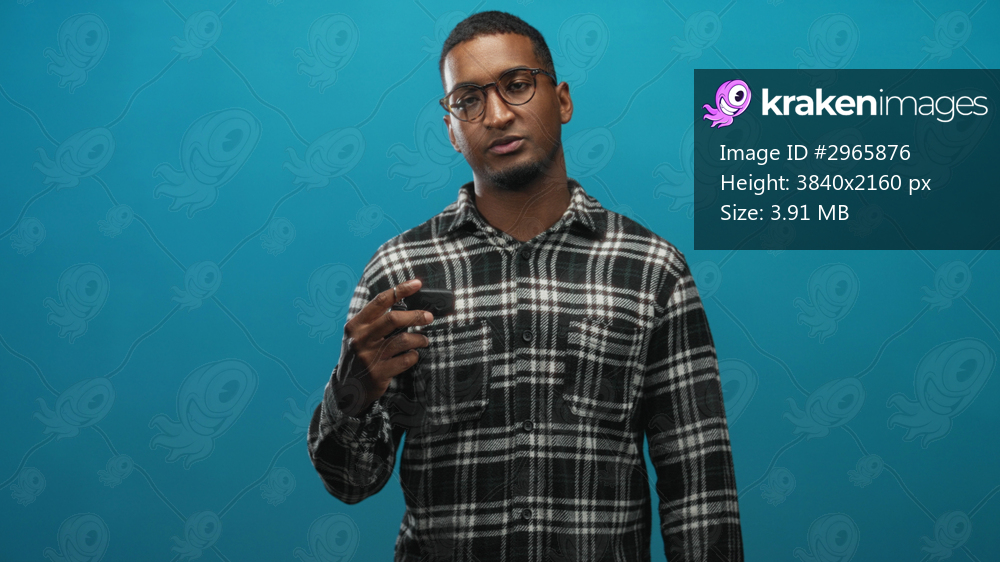 Man holding car keys with right hand, wearing glasses and black plaid shirt against turquoise backdrop in studio; casual confidence.