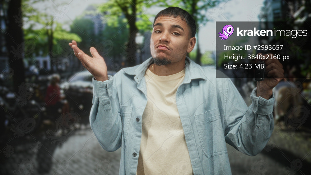 Man holding car keys, shrugging with palm up and finger to cheek, young hispanic male standing on a street with blurred cars and trees; indecision dilemma. - Kraken Images